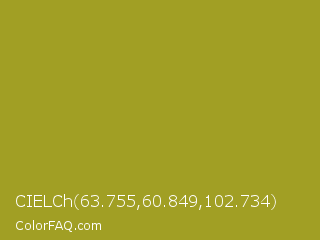 CIELCh 63.755,60.849,102.734 Color is a normal yellow color and the nearest color is Lemon Ginger #ac9e22. Hex code #a19f24 and RGB value is rgb(161,159,36). In RGB color space, this color is composed of 63% red, 62% green, 14% blue, In CMYK color space, this color is composed of 0% cyan, 1% magenta, 78% yellow , 37% black , In HSL color space, this color has a hue angle of 59° , 63% saturation and 39% lightness.