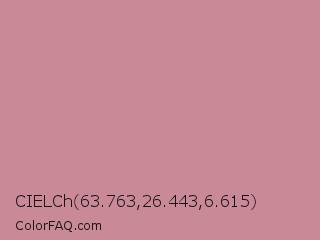 CIELCh 63.763,26.443,6.615 Color is a light red color and the nearest color is Puce #cc8899. Hex code #c98996 and RGB value is rgb(201,137,150). In RGB color space, this color is composed of 79% red, 54% green, 59% blue, In CMYK color space, this color is composed of 0% cyan, 32% magenta, 25% yellow , 21% black , In HSL color space, this color has a hue angle of 348° , 37% saturation and 66% lightness.