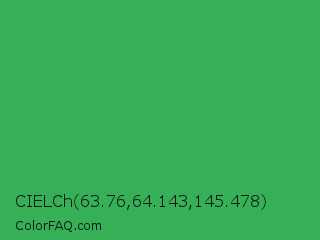 CIELCh 63.76,64.143,145.478 Color is a normal green color and the nearest color is Chateau Green #40a860. Hex code #36b056 and RGB value is rgb(54,176,86). In RGB color space, this color is composed of 21% red, 69% green, 34% blue, In CMYK color space, this color is composed of 69% cyan, 0% magenta, 51% yellow , 31% black , In HSL color space, this color has a hue angle of 136° , 53% saturation and 45% lightness.
