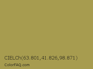 CIELCh 63.801,41.826,98.871 Color is a normal yellow color and the nearest color is Limed Oak #ac8a56. Hex code #a79c4f and RGB value is rgb(167,156,79). In RGB color space, this color is composed of 65% red, 61% green, 31% blue, In CMYK color space, this color is composed of 0% cyan, 7% magenta, 53% yellow , 35% black , In HSL color space, this color has a hue angle of 53° , 36% saturation and 48% lightness.