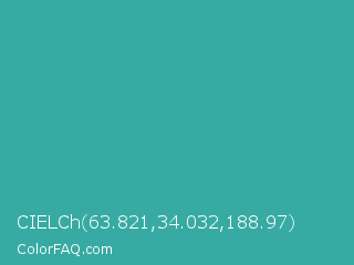 CIELCh 63.821,34.032,188.97 Color is a normal cyan color and the nearest color is Keppel #3ab09e. Hex code #37aba3 and RGB value is rgb(55,171,163). In RGB color space, this color is composed of 22% red, 67% green, 64% blue, In CMYK color space, this color is composed of 68% cyan, 0% magenta, 5% yellow , 33% black , In HSL color space, this color has a hue angle of 176° , 51% saturation and 44% lightness.