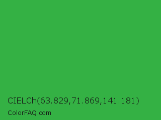 CIELCh 63.829,71.869,141.181 Color is a normal green color and the nearest color is Wageningen Green #34b233. Hex code #34b144 and RGB value is rgb(52,177,68). In RGB color space, this color is composed of 20% red, 69% green, 27% blue, In CMYK color space, this color is composed of 71% cyan, 0% magenta, 62% yellow , 31% black , In HSL color space, this color has a hue angle of 128° , 55% saturation and 45% lightness.
