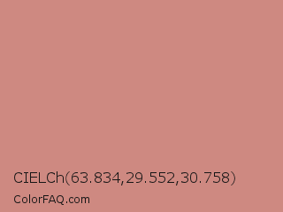 CIELCh 63.834,29.552,30.758 Color is a light red color and the nearest color is New York Pink #d7837f. Hex code #ce8981 and RGB value is rgb(206,137,129). In RGB color space, this color is composed of 81% red, 54% green, 51% blue, In CMYK color space, this color is composed of 0% cyan, 33% magenta, 37% yellow , 19% black , In HSL color space, this color has a hue angle of 6° , 44% saturation and 66% lightness.