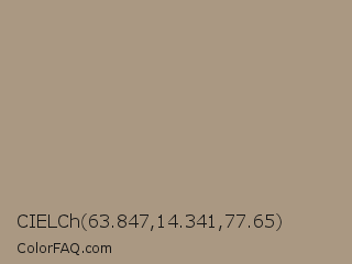 CIELCh 63.847,14.341,77.65 Color is a normal orange color and the nearest color is Grullo #a99a86. Hex code #aa9882 and RGB value is rgb(170,152,130). In RGB color space, this color is composed of 67% red, 60% green, 51% blue, In CMYK color space, this color is composed of 0% cyan, 11% magenta, 24% yellow , 33% black , In HSL color space, this color has a hue angle of 33° , 19% saturation and 59% lightness.