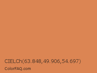 CIELCh 63.848,49.906,54.697 Color is a normal orange color and the nearest color is Raw Sienna #d68a59. Hex code #dc8553 and RGB value is rgb(220,133,83). In RGB color space, this color is composed of 86% red, 52% green, 33% blue, In CMYK color space, this color is composed of 0% cyan, 40% magenta, 62% yellow , 14% black , In HSL color space, this color has a hue angle of 22° , 66% saturation and 59% lightness.