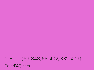 CIELCh 63.848,68.402,331.473 Color is a light magenta color and the nearest color is Orchid #da70d6. Hex code #e66dd6 and RGB value is rgb(230,109,214). In RGB color space, this color is composed of 90% red, 43% green, 84% blue, In CMYK color space, this color is composed of 0% cyan, 53% magenta, 7% yellow , 10% black , In HSL color space, this color has a hue angle of 308° , 71% saturation and 66% lightness.