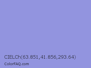 CIELCh 63.851,41.856,293.64 Color is a light blue color and the nearest color is Portage #8b9fee. Hex code #9294df and RGB value is rgb(146,148,223). In RGB color space, this color is composed of 57% red, 58% green, 87% blue, In CMYK color space, this color is composed of 35% cyan, 34% magenta, 0% yellow , 13% black , In HSL color space, this color has a hue angle of 238° , 55% saturation and 72% lightness.