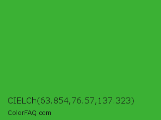 CIELCh 63.854,76.57,137.323 Color is a normal green color and the nearest color is Wageningen Green #34b233. Hex code #3bb134 and RGB value is rgb(59,177,52). In RGB color space, this color is composed of 23% red, 69% green, 20% blue, In CMYK color space, this color is composed of 67% cyan, 0% magenta, 71% yellow , 31% black , In HSL color space, this color has a hue angle of 117° , 55% saturation and 45% lightness.