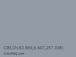 CIELCh 63.869,6.607,257.038 Color is a light blue color and the nearest color is Manatee #979aaa. Hex code #929ca6 and RGB value is rgb(146,156,166). In RGB color space, this color is composed of 57% red, 61% green, 65% blue, In CMYK color space, this color is composed of 12% cyan, 6% magenta, 0% yellow , 35% black , In HSL color space, this color has a hue angle of 210° , 10% saturation and 61% lightness.