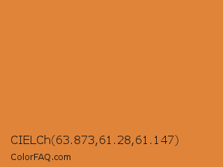 CIELCh 63.873,61.28,61.147 Color is a normal orange color and the nearest color is Tigers Eye #e08d3c. Hex code #e08439 and RGB value is rgb(224,132,57). In RGB color space, this color is composed of 88% red, 52% green, 22% blue, In CMYK color space, this color is composed of 0% cyan, 41% magenta, 75% yellow , 12% black , In HSL color space, this color has a hue angle of 27° , 73% saturation and 55% lightness.