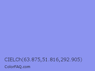 CIELCh 63.875,51.816,292.905 Color is a light blue color and the nearest color is Portage #8b9fee. Hex code #8b93f0 and RGB value is rgb(139,147,240). In RGB color space, this color is composed of 55% red, 58% green, 94% blue, In CMYK color space, this color is composed of 42% cyan, 39% magenta, 0% yellow , 6% black , In HSL color space, this color has a hue angle of 235° , 77% saturation and 74% lightness.