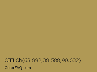 CIELCh 63.892,38.588,90.632 Color is a normal orange color and the nearest color is Teak #b19461. Hex code #b09955 and RGB value is rgb(176,153,85). In RGB color space, this color is composed of 69% red, 60% green, 33% blue, In CMYK color space, this color is composed of 0% cyan, 13% magenta, 52% yellow , 31% black , In HSL color space, this color has a hue angle of 45° , 37% saturation and 51% lightness.