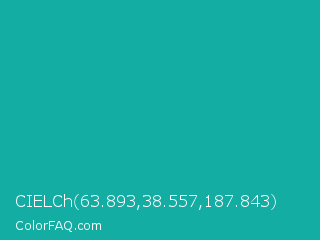 CIELCh 63.893,38.557,187.843 Color is a normal cyan color and the nearest color is Light Sea Green #20b2aa. Hex code #13ada3 and RGB value is rgb(19,173,163). In RGB color space, this color is composed of 7% red, 68% green, 64% blue, In CMYK color space, this color is composed of 89% cyan, 0% magenta, 6% yellow , 32% black , In HSL color space, this color has a hue angle of 176° , 80% saturation and 38% lightness.