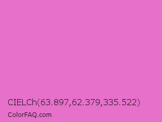 CIELCh 63.897,62.379,335.522 Color is a light magenta color and the nearest color is Orchid #da70d6. Hex code #e670ca and RGB value is rgb(230,112,202). In RGB color space, this color is composed of 90% red, 44% green, 79% blue, In CMYK color space, this color is composed of 0% cyan, 51% magenta, 12% yellow , 10% black , In HSL color space, this color has a hue angle of 314° , 70% saturation and 67% lightness.