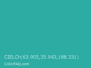 CIELCh 63.905,35.943,188.331 Color is a normal cyan color and the nearest color is Light Sea Green #20b2aa. Hex code #2caca3 and RGB value is rgb(44,172,163). In RGB color space, this color is composed of 17% red, 67% green, 64% blue, In CMYK color space, this color is composed of 74% cyan, 0% magenta, 5% yellow , 33% black , In HSL color space, this color has a hue angle of 176° , 59% saturation and 42% lightness.