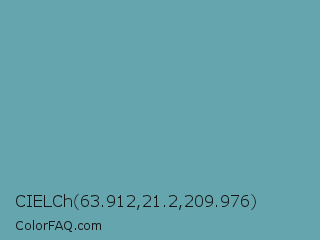 CIELCh 63.912,21.2,209.976 Color is a normal cyan color and the nearest color is Tradewind #5fb3ac. Hex code #65a5ad and RGB value is rgb(101,165,173). In RGB color space, this color is composed of 40% red, 65% green, 68% blue, In CMYK color space, this color is composed of 42% cyan, 5% magenta, 0% yellow , 32% black , In HSL color space, this color has a hue angle of 187° , 31% saturation and 54% lightness.