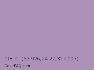 CIELCh 63.926,24.27,317.995 Color is a light purple color and the nearest color is Glossy Grape #ab92b3. Hex code #ae91b8 and RGB value is rgb(174,145,184). In RGB color space, this color is composed of 68% red, 57% green, 72% blue, In CMYK color space, this color is composed of 5% cyan, 21% magenta, 0% yellow , 28% black , In HSL color space, this color has a hue angle of 285° , 22% saturation and 65% lightness.