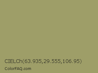 CIELCh 63.935,29.555,106.95 Color is a normal yellow color and the nearest color is Gurkha #9a9577. Hex code #9e9e68 and RGB value is rgb(158,158,104). In RGB color space, this color is composed of 62% red, 62% green, 41% blue, In CMYK color space, this color is composed of 0% cyan, 0% magenta, 34% yellow , 38% black , In HSL color space, this color has a hue angle of 60° , 22% saturation and 51% lightness.