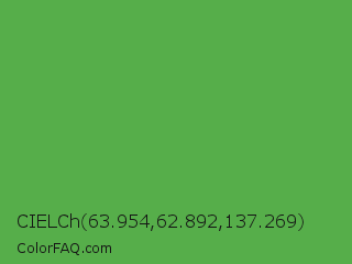 CIELCh 63.954,62.892,137.269 Color is a normal green color and the nearest color is Apple #4fa83d. Hex code #56ae4a and RGB value is rgb(86,174,74). In RGB color space, this color is composed of 34% red, 68% green, 29% blue, In CMYK color space, this color is composed of 51% cyan, 0% magenta, 57% yellow , 32% black , In HSL color space, this color has a hue angle of 113° , 40% saturation and 49% lightness.