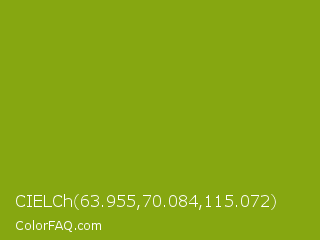 CIELCh 63.955,70.084,115.072 Color is a normal lime color and the nearest color is Apple Green #8db600. Hex code #86a711 and RGB value is rgb(134,167,17). In RGB color space, this color is composed of 53% red, 65% green, 7% blue, In CMYK color space, this color is composed of 20% cyan, 0% magenta, 90% yellow , 35% black , In HSL color space, this color has a hue angle of 73° , 82% saturation and 36% lightness.