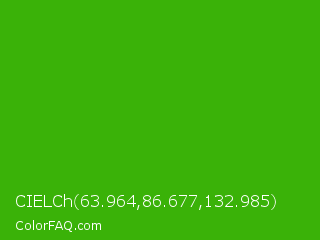 CIELCh 63.964,86.677,132.985 Color is a normal green color and the nearest color is Kelly Green #4cbb17. Hex code #3ab208 and RGB value is rgb(58,178,8). In RGB color space, this color is composed of 23% red, 70% green, 3% blue, In CMYK color space, this color is composed of 67% cyan, 0% magenta, 96% yellow , 30% black , In HSL color space, this color has a hue angle of 102° , 91% saturation and 36% lightness.
