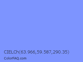 CIELCh 63.966,59.587,290.35 Color is a light blue color and the nearest color is Portage #8b9fee. Hex code #7d94ff and RGB value is rgb(125,148,255). In RGB color space, this color is composed of 49% red, 58% green, 100% blue, In CMYK color space, this color is composed of 51% cyan, 42% magenta, 0% yellow , 0% black , In HSL color space, this color has a hue angle of 229° , 100% saturation and 75% lightness.