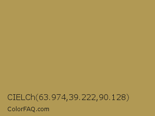 CIELCh 63.974,39.222,90.128 Color is a normal orange color and the nearest color is Husk #b7a458. Hex code #b19954 and RGB value is rgb(177,153,84). In RGB color space, this color is composed of 69% red, 60% green, 33% blue, In CMYK color space, this color is composed of 0% cyan, 14% magenta, 53% yellow , 31% black , In HSL color space, this color has a hue angle of 45° , 37% saturation and 51% lightness.