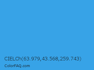 CIELCh 63.979,43.568,259.743 Color is a normal blue color and the nearest color is Picton Blue #45b1e8. Hex code #37a3e7 and RGB value is rgb(55,163,231). In RGB color space, this color is composed of 22% red, 64% green, 91% blue, In CMYK color space, this color is composed of 76% cyan, 29% magenta, 0% yellow , 9% black , In HSL color space, this color has a hue angle of 203° , 79% saturation and 56% lightness.