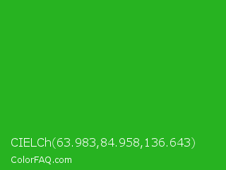 CIELCh 63.983,84.958,136.643 Color is a normal green color and the nearest color is Wageningen Green #34b233. Hex code #27b321 and RGB value is rgb(39,179,33). In RGB color space, this color is composed of 15% red, 70% green, 13% blue, In CMYK color space, this color is composed of 78% cyan, 0% magenta, 82% yellow , 30% black , In HSL color space, this color has a hue angle of 118° , 69% saturation and 42% lightness.