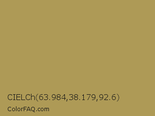 CIELCh 63.984,38.179,92.6 Color is a normal yellow color and the nearest color is Teak #b19461. Hex code #ae9a56 and RGB value is rgb(174,154,86). In RGB color space, this color is composed of 68% red, 60% green, 34% blue, In CMYK color space, this color is composed of 0% cyan, 11% magenta, 51% yellow , 32% black , In HSL color space, this color has a hue angle of 46° , 35% saturation and 51% lightness.