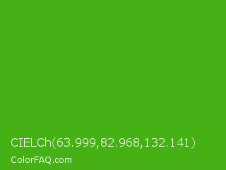 CIELCh 63.999,82.968,132.141 Color is a normal green color and the nearest color is Kelly Green #4cbb17. Hex code #46b115 and RGB value is rgb(70,177,21). In RGB color space, this color is composed of 27% red, 69% green, 8% blue, In CMYK color space, this color is composed of 60% cyan, 0% magenta, 88% yellow , 31% black , In HSL color space, this color has a hue angle of 101° , 79% saturation and 39% lightness.