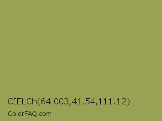 CIELCh 64.003,41.54,111.12 Color is a normal yellow color and the nearest color is Moss Green #8a9a5b. Hex code #98a154 and RGB value is rgb(152,161,84). In RGB color space, this color is composed of 60% red, 63% green, 33% blue, In CMYK color space, this color is composed of 6% cyan, 0% magenta, 48% yellow , 37% black , In HSL color space, this color has a hue angle of 67° , 31% saturation and 48% lightness.