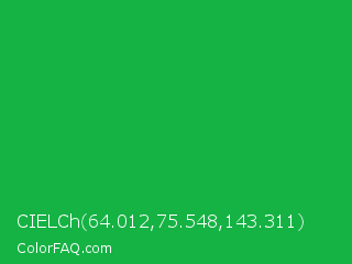 CIELCh 64.012,75.548,143.311 Color is a normal green color and the nearest color is Green Pantone #00ad43. Hex code #15b344 and RGB value is rgb(21,179,68). In RGB color space, this color is composed of 8% red, 70% green, 27% blue, In CMYK color space, this color is composed of 88% cyan, 0% magenta, 62% yellow , 30% black , In HSL color space, this color has a hue angle of 138° , 79% saturation and 39% lightness.
