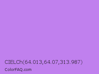 CIELCh 64.013,64.07,313.987 Color is a light purple color and the nearest color is Lavender #b57edc. Hex code #c080ee and RGB value is rgb(192,128,238). In RGB color space, this color is composed of 75% red, 50% green, 93% blue, In CMYK color space, this color is composed of 19% cyan, 46% magenta, 0% yellow , 7% black , In HSL color space, this color has a hue angle of 275° , 76% saturation and 72% lightness.
