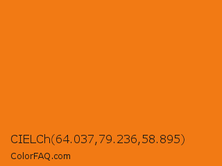CIELCh 64.037,79.236,58.895 Color is a normal orange color and the nearest color is Ecstasy #fa7814. Hex code #f27a14 and RGB value is rgb(242,122,20). In RGB color space, this color is composed of 95% red, 48% green, 8% blue, In CMYK color space, this color is composed of 0% cyan, 50% magenta, 92% yellow , 5% black , In HSL color space, this color has a hue angle of 28° , 90% saturation and 51% lightness.