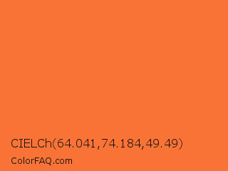 CIELCh 64.041,74.184,49.49 Color is a normal orange color and the nearest color is Orange Crayola #ff7538. Hex code #fa7336 and RGB value is rgb(250,115,54). In RGB color space, this color is composed of 98% red, 45% green, 21% blue, In CMYK color space, this color is composed of 0% cyan, 54% magenta, 78% yellow , 2% black , In HSL color space, this color has a hue angle of 19° , 95% saturation and 60% lightness.