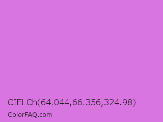 CIELCh 64.044,66.356,324.98 Color is a light magenta color and the nearest color is Orchid #da70d6. Hex code #d975e0 and RGB value is rgb(217,117,224). In RGB color space, this color is composed of 85% red, 46% green, 88% blue, In CMYK color space, this color is composed of 3% cyan, 48% magenta, 0% yellow , 12% black , In HSL color space, this color has a hue angle of 296° , 63% saturation and 67% lightness.
