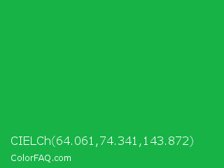 CIELCh 64.061,74.341,143.872 Color is a normal green color and the nearest color is Green Pantone #00ad43. Hex code #17b347 and RGB value is rgb(23,179,71). In RGB color space, this color is composed of 9% red, 70% green, 28% blue, In CMYK color space, this color is composed of 87% cyan, 0% magenta, 60% yellow , 30% black , In HSL color space, this color has a hue angle of 138° , 77% saturation and 40% lightness.
