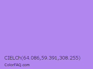 CIELCh 64.086,59.391,308.255 Color is a light violet color and the nearest color is Lavender #b57edc. Hex code #b187ef and RGB value is rgb(177,135,239). In RGB color space, this color is composed of 69% red, 53% green, 94% blue, In CMYK color space, this color is composed of 26% cyan, 44% magenta, 0% yellow , 6% black , In HSL color space, this color has a hue angle of 264° , 76% saturation and 73% lightness.
