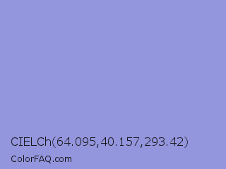 CIELCh 64.095,40.157,293.42 Color is a light blue color and the nearest color is Ceil #92a1cf. Hex code #9395dd and RGB value is rgb(147,149,221). In RGB color space, this color is composed of 58% red, 58% green, 87% blue, In CMYK color space, this color is composed of 33% cyan, 33% magenta, 0% yellow , 13% black , In HSL color space, this color has a hue angle of 238° , 52% saturation and 72% lightness.