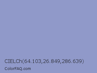 CIELCh 64.103,26.849,286.639 Color is a light blue color and the nearest color is Blue Bell Crayola #9999cc. Hex code #9099c9 and RGB value is rgb(144,153,201). In RGB color space, this color is composed of 56% red, 60% green, 79% blue, In CMYK color space, this color is composed of 28% cyan, 24% magenta, 0% yellow , 21% black , In HSL color space, this color has a hue angle of 231° , 35% saturation and 68% lightness.