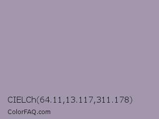 CIELCh 64.11,13.117,311.178 Color is a light purple color and the nearest color is Amethyst Smoke #a397b4. Hex code #a397ad and RGB value is rgb(163,151,173). In RGB color space, this color is composed of 64% red, 59% green, 68% blue, In CMYK color space, this color is composed of 6% cyan, 13% magenta, 0% yellow , 32% black , In HSL color space, this color has a hue angle of 273° , 12% saturation and 64% lightness.