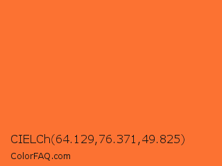 CIELCh 64.129,76.371,49.825 Color is a normal orange color and the nearest color is Burning Orange #ff7034. Hex code #fc7232 and RGB value is rgb(252,114,50). In RGB color space, this color is composed of 99% red, 45% green, 20% blue, In CMYK color space, this color is composed of 0% cyan, 55% magenta, 80% yellow , 1% black , In HSL color space, this color has a hue angle of 19° , 97% saturation and 59% lightness.