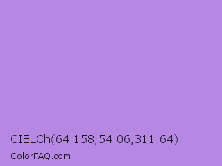CIELCh 64.158,54.06,311.64 Color is a light purple color and the nearest color is Lavender #b57edc. Hex code #b787e4 and RGB value is rgb(183,135,228). In RGB color space, this color is composed of 72% red, 53% green, 89% blue, In CMYK color space, this color is composed of 20% cyan, 41% magenta, 0% yellow , 11% black , In HSL color space, this color has a hue angle of 271° , 63% saturation and 71% lightness.