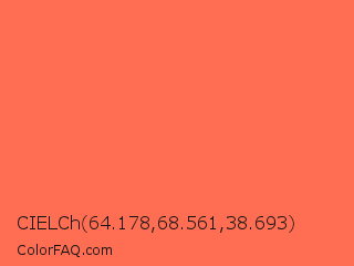 CIELCh 64.178,68.561,38.693 Color is a light red color and the nearest color is Persimmon #ff6b53. Hex code #ff6e52 and RGB value is rgb(255,110,82). In RGB color space, this color is composed of 100% red, 43% green, 32% blue, In CMYK color space, this color is composed of 0% cyan, 57% magenta, 68% yellow , 0% black , In HSL color space, this color has a hue angle of 10° , 100% saturation and 66% lightness.
