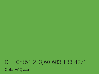 CIELCh 64.213,60.683,133.427 Color is a normal green color and the nearest color is Green RYB #66b032. Hex code #64ad48 and RGB value is rgb(100,173,72). In RGB color space, this color is composed of 39% red, 68% green, 28% blue, In CMYK color space, this color is composed of 42% cyan, 0% magenta, 58% yellow , 32% black , In HSL color space, this color has a hue angle of 103° , 41% saturation and 48% lightness.
