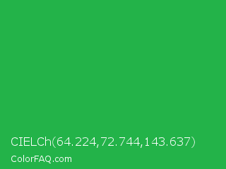 CIELCh 64.224,72.744,143.637 Color is a normal green color and the nearest color is Wageningen Green #34b233. Hex code #23b349 and RGB value is rgb(35,179,73). In RGB color space, this color is composed of 14% red, 70% green, 29% blue, In CMYK color space, this color is composed of 80% cyan, 0% magenta, 59% yellow , 30% black , In HSL color space, this color has a hue angle of 136° , 67% saturation and 42% lightness.