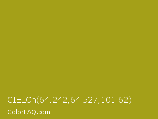 CIELCh 64.242,64.527,101.62 Color is a normal yellow color and the nearest color is Lucky #af9f1c. Hex code #a4a018 and RGB value is rgb(164,160,24). In RGB color space, this color is composed of 64% red, 63% green, 9% blue, In CMYK color space, this color is composed of 0% cyan, 2% magenta, 85% yellow , 36% black , In HSL color space, this color has a hue angle of 58° , 74% saturation and 37% lightness.