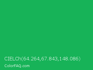 CIELCh 64.264,67.843,148.086 Color is a normal green color and the nearest color is Green Pigment #00a550. Hex code #17b358 and RGB value is rgb(23,179,88). In RGB color space, this color is composed of 9% red, 70% green, 35% blue, In CMYK color space, this color is composed of 87% cyan, 0% magenta, 51% yellow , 30% black , In HSL color space, this color has a hue angle of 145° , 77% saturation and 40% lightness.