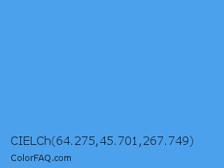 CIELCh 64.275,45.701,267.749 Color is a light blue color and the nearest color is Picton Blue #45b1e8. Hex code #4ca1ed and RGB value is rgb(76,161,237). In RGB color space, this color is composed of 30% red, 63% green, 93% blue, In CMYK color space, this color is composed of 68% cyan, 32% magenta, 0% yellow , 7% black , In HSL color space, this color has a hue angle of 208° , 82% saturation and 61% lightness.